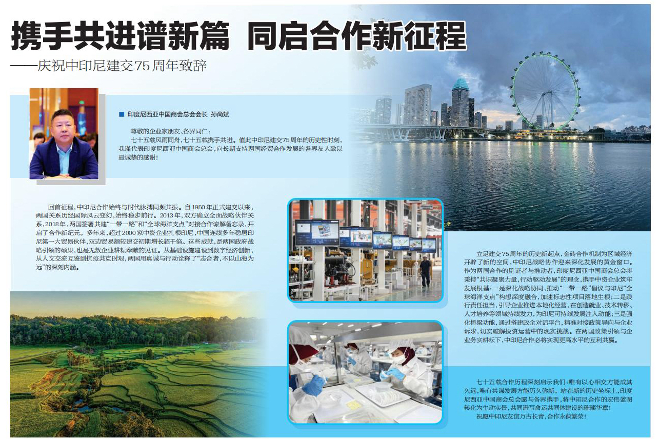 七十五载风雨同舟,七十五载携手共进。值此中印尼建交75周年的历史性时刻,我谨代表印度尼西亚中国商会总会,向长期支持两国经贸合作发展的各界友人致以最诚挚的感谢!